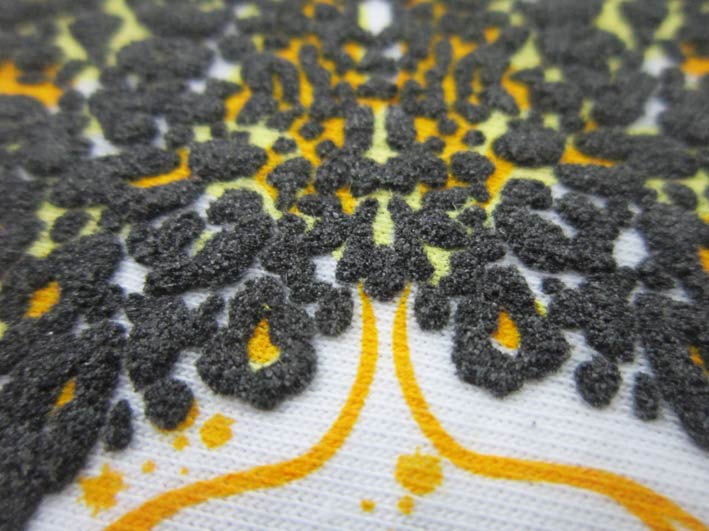 Τυπώνουμε σε t–shirt ή κομματιαστό ύφασμα, χρησιμοποιώντας ειδικά μελάνια και τεχνική εκτύπωσης για να μας δώσει ιδιαίτερη υφή στο σχέδιό μας, που μοιάζουν με βελούδο. Ανάλογα με την ποσότητα του μελανιού στο τύπωμα και στον πολυμερισμό (θερμοκρασία στον φούρνο) εξαρτάται και το αποτέλεσμα της υφής του τυπώματος.