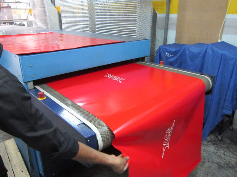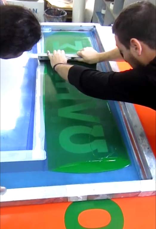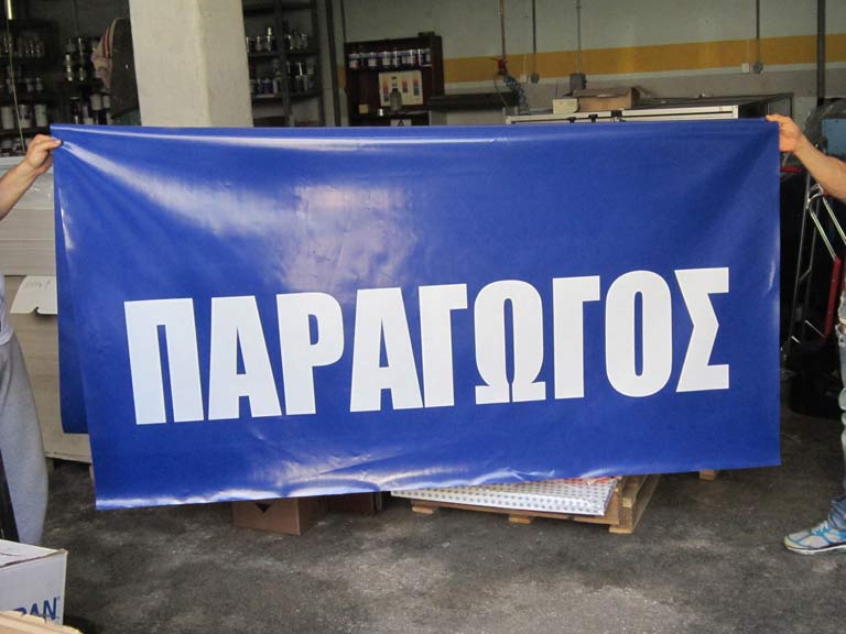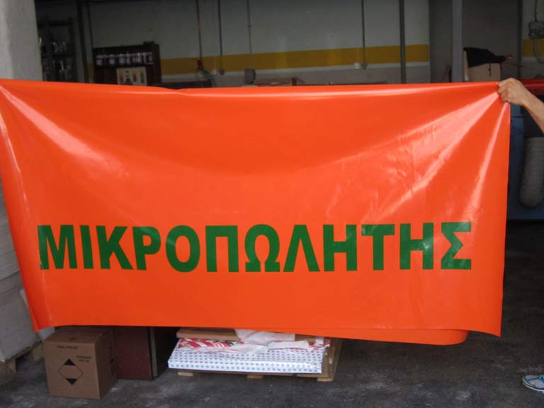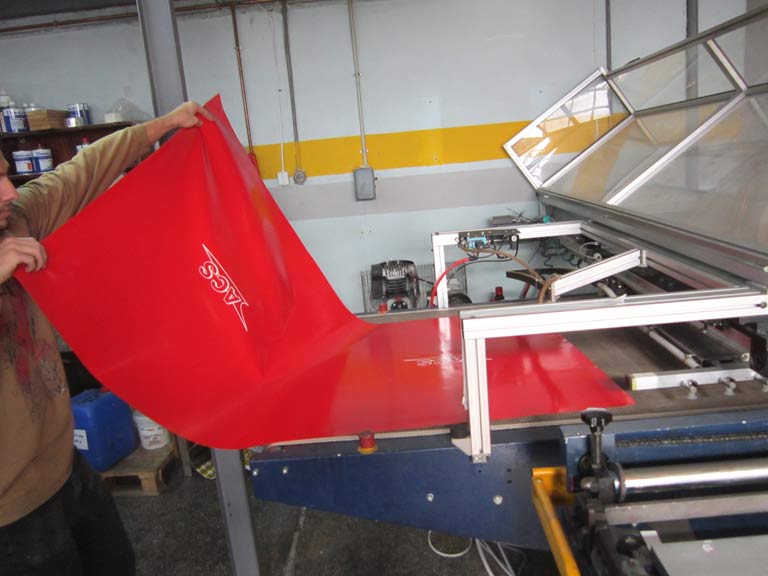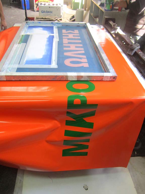 Εκτύπωση χειροκίνητα ή με αυτόματη μηχανή μεταξοτυπίας σε μουσαμά με μελάνια διαλύτη, για Large ή Extra Large εκτυπώσεις. Χρήση εκτύπωσης για κατασκευές εξωτερικού χώρου καλύματα κλπ. ή ακόμα για σάκους μεταφοράς αλληλογραφίας και δεμάτων.